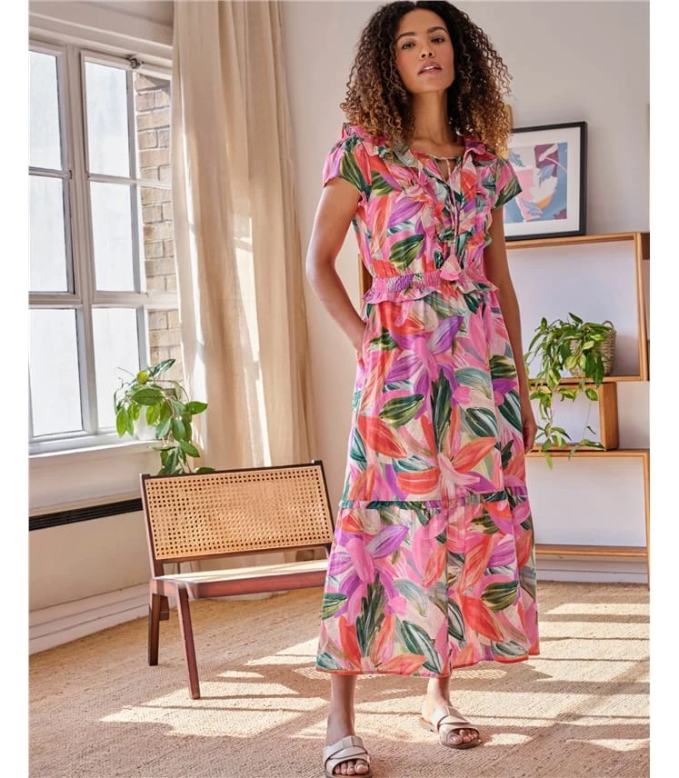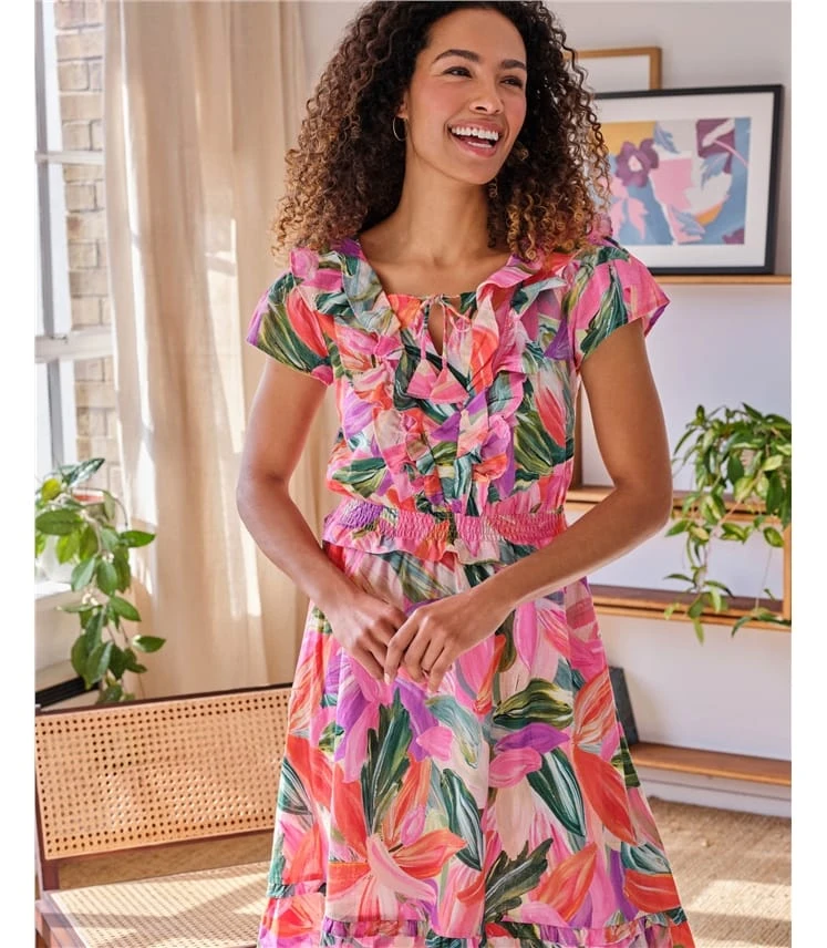 Profitez au maximum de l’été avec cette magnifique robe à imprimé floral exclusif ! Elle est parfaite pour les promenades dans la nature, les journées à la plage et tout ce qui se trouve entre les deux. Vous pouvez également l’associer à un cardigan douillet pour les soirées plus fraîches. La robe est dotée de volants et de liens sur le devant, d’une taille élastiquée et d’un bas de robe, pour un look d’été à la fois élégant et confortable. De nos amis de Thought.