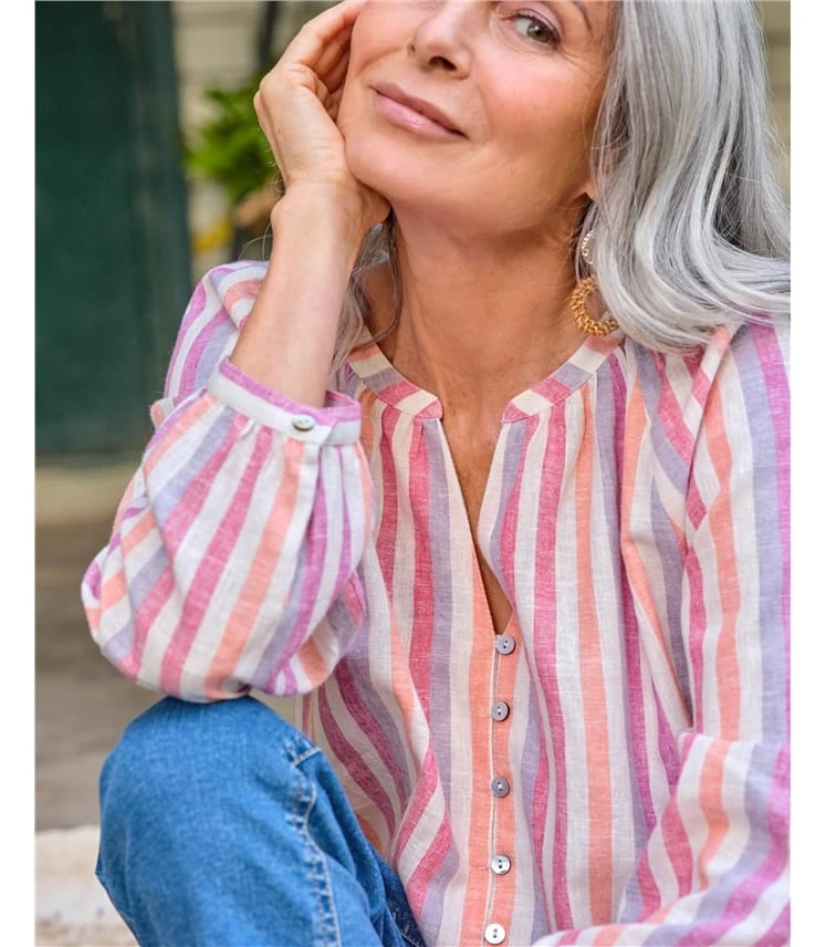 Cette chemise est fabriquée à partir d’un mélange de 55 % de lin et de 45 % de coton pour vous garder au frais et à l’aise pendant les journées chaudes. Les boutons en coquille ajoutent une touche d’élégance et de raffinement. L’élégante encolure en V et le motif rayé coloré rendent cette chemise parfaite pour un look d’été.