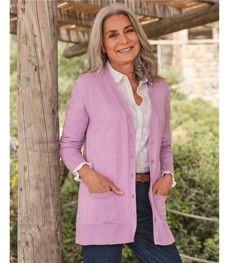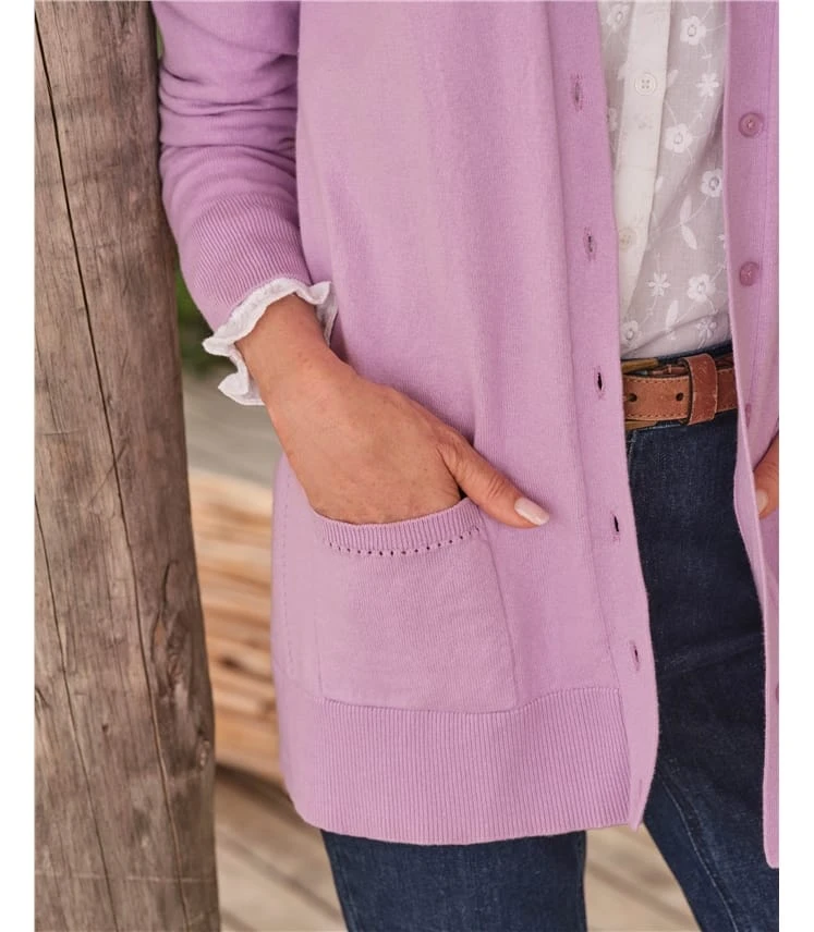 Une couche douce à enfiler lorsque les choses deviennent un peu froides. Ce long cardigan classique avec un col en V flatteur est parfait à superposer. Il y a deux poches fonctionnelles avec des détails en pointelle et la patte est dotée de boutons de couleur assortie pour une touche finale élégante. Le coton frais mélangé au luxe ultra doux du cachemire en fait un tricot léger parfait pour les mois les plus chauds.