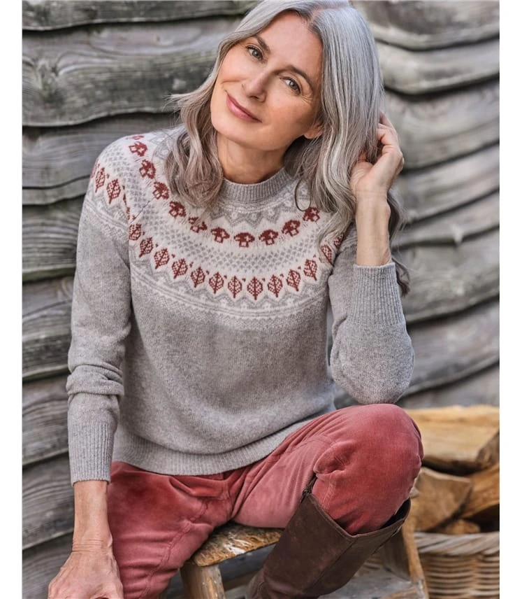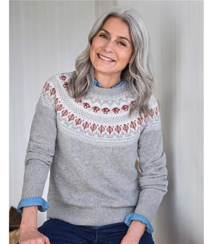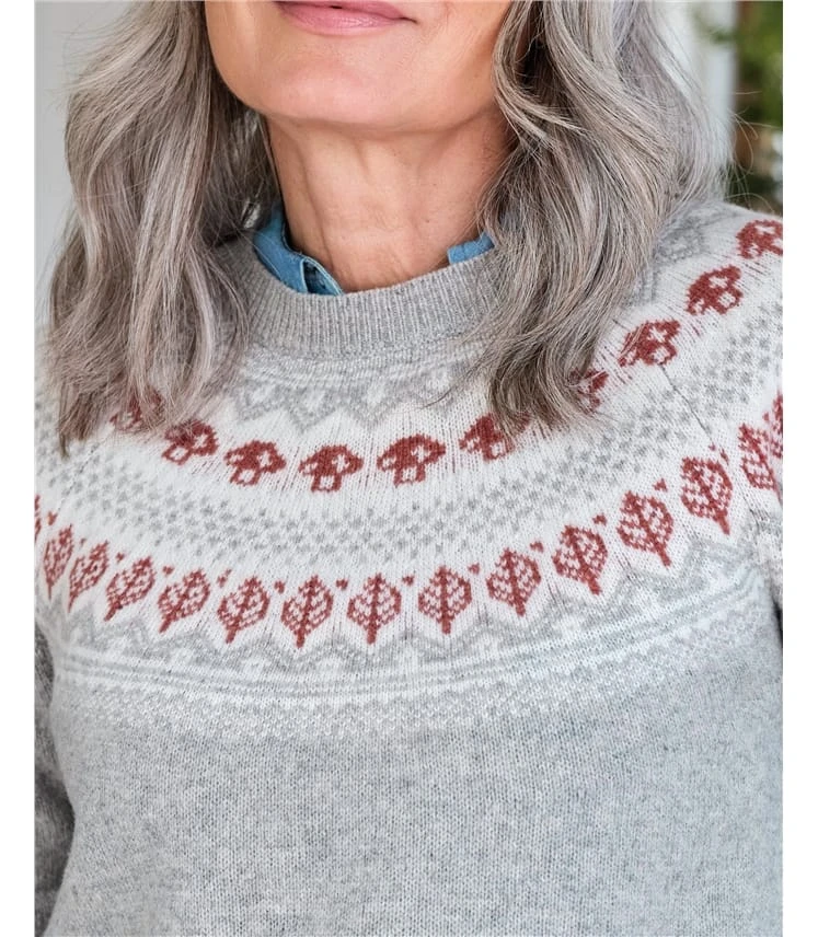 Ajoutez un peu de magie Ă votre garde-robe au quotidien. Nous avons apportĂ© notre propre touche Ă un motif emblĂ©matique en jacquard autour de l’empiècement en ajoutant des motifs boisĂ©s rappelant la romance de vos contes de fĂ©es. Les petites feuilles et les champignons sucrĂ©s ajoutent un caractère ludique et ne manqueront pas de faire sourire non seulement votre propre visage. Un col rond classique et des ourlets cĂ´telĂ©s vous aident Ă rester au chaud et le pull est fabriquĂ© en pure laine d’agneau pour un confort tout au long de la journĂ©e.