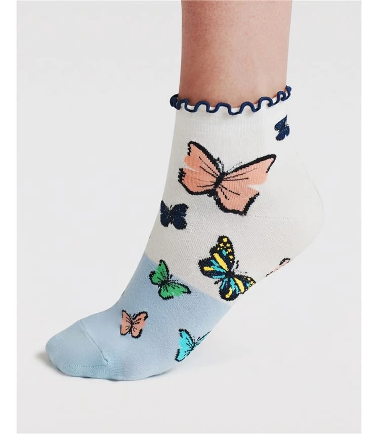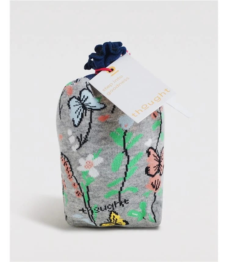 Ces chaussettes super douces en coton biologique sont présentées dans un paquet de 2 avec de délicats motifs de papillons. Une paire de chaussettes grises à motifs de papillons floraux et une paire avec un joli bord froncé. De nos amis de Thought.