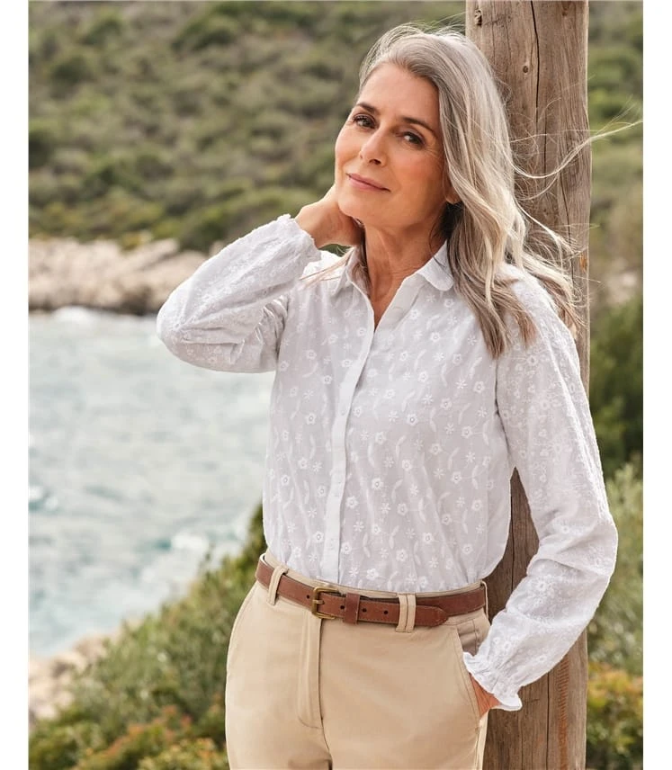 Cette chemise blanche classique, fabriquée à partir de 100 % de coton, offre une sensation de netteté et de confort. Dotée d’un charmant col pétale et d’une délicate broderie sur l’ensemble du corps, cette chemise exsude une élégance intemporelle. Les poignets à volants ajoutent une touche féminine, tandis que les boutons fonctionnels sur le devant assurent un aspect pratique. Parfaite pour les superpositions, cette chemise polyvalente est un élément essentiel de la garde-robe en toute saison.