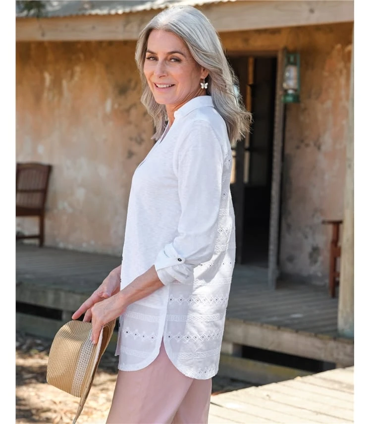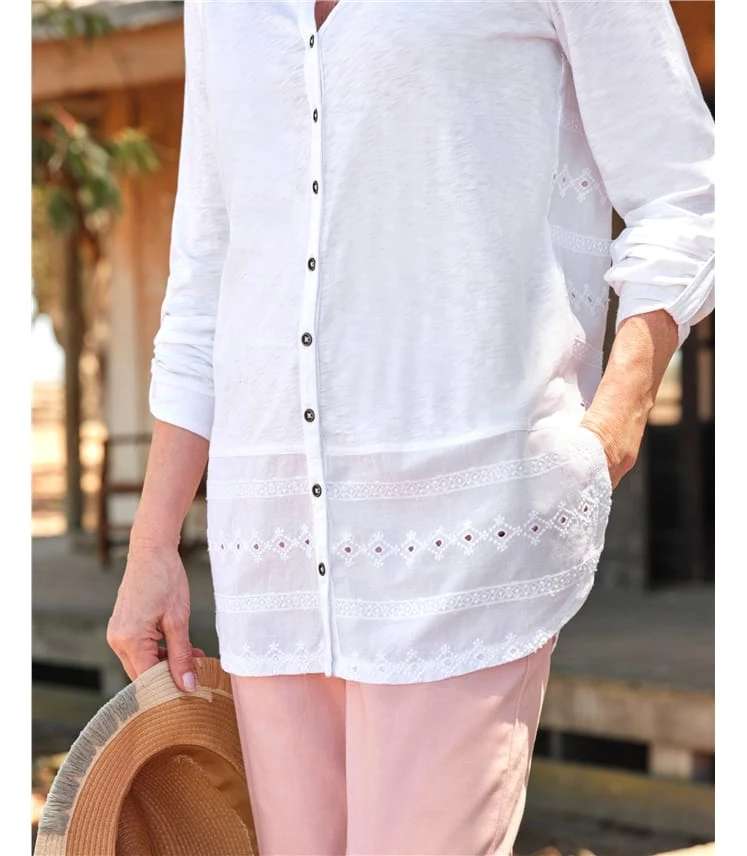 Cette chemise tunique à col avec son magnifique empiècement en broderie ajoute du romantisme à votre look. Avec sa languette retroussable et ses manches boutonnées, il est élégant sans effort et est idéal pour rester au frais tout l’été. Fabriqué en coton biologique léger et doux qui est agréable sur votre peau.