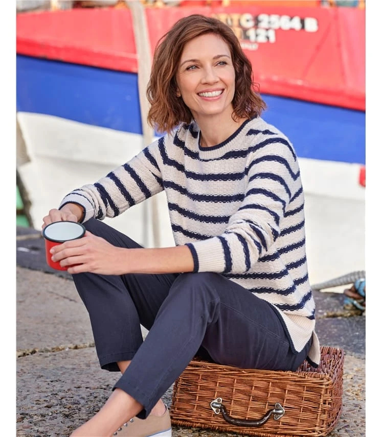 Mettez le cap sur de nouvelles aventures avec notre version texturée du pull à rayures breton classique. Ce motif élégant a sa place dans toutes les garde-robes. Bien que le motif soit resté fidèle à la forme, le pull a un point de tissage en panier qui lui donne un aspect texturé, ce qui fait de ce basique du style quelque chose de spécial. L’ourlet est fendu sur le côté pour plus de confort.