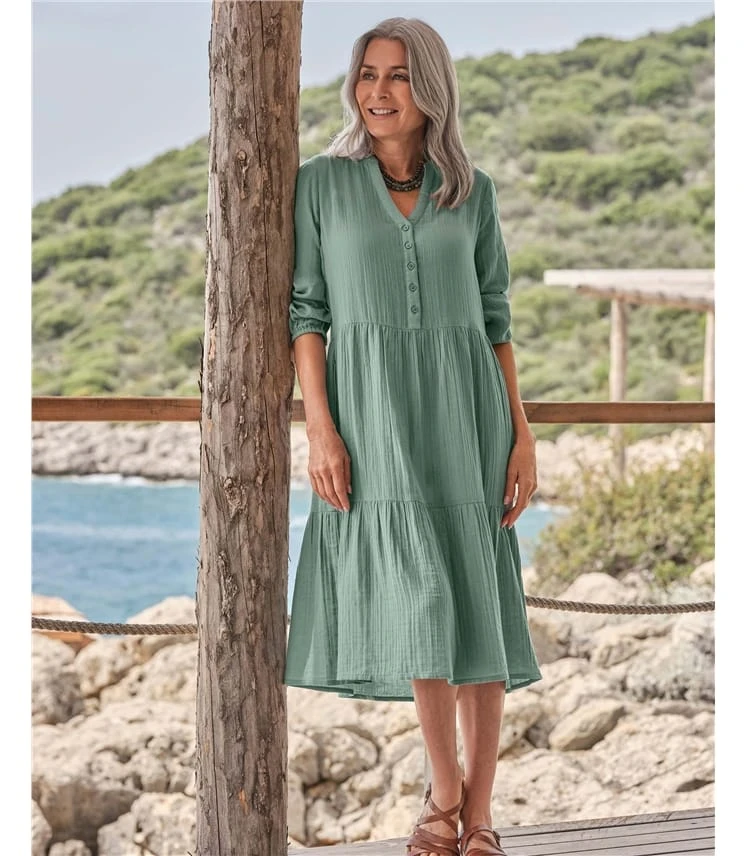 Incorporez une sophistication aérienne à votre garde-robe avec notre robe 100 % coton. L’encolure échancrée avec boutons ajoute une touche supplémentaire à son design unique. La longueur midi et les détails à étages créent une silhouette élégante, ce qui en fait le choix idéal pour toutes les occasions.