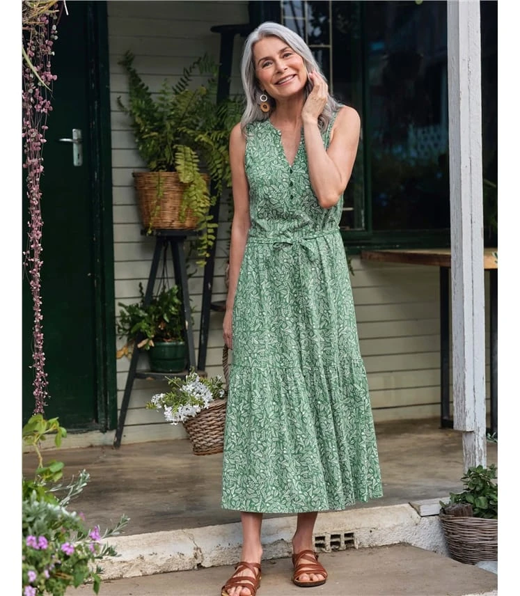 La robe aérienne sans manches parfaite pour les journées d’été les plus chaudes. Un col cranté détaillé et des boutons sur le devant avec un lien à la taille créent une silhouette flatteuse. La jupe à volants ajoute de la fluidité et du mouvement lorsque vous marchez. Un imprimé blanc contrastant sur le fond clair ajoute la touche de couleur dont votre tenue d’été a besoin.