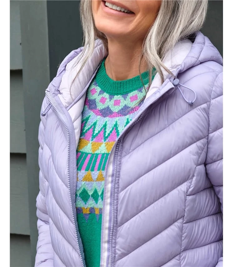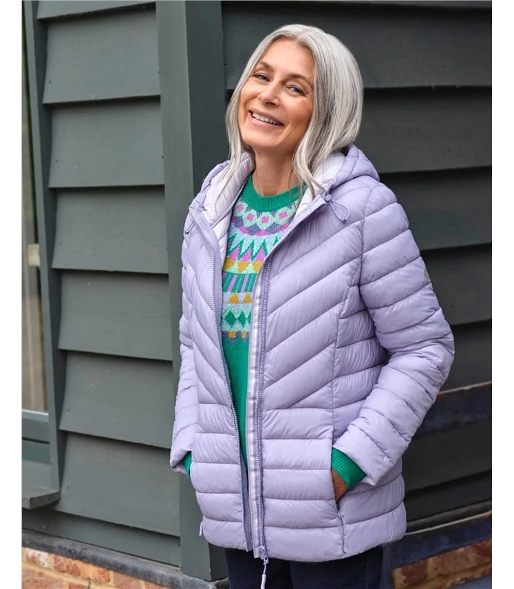 Made from 100% recycled materials this is your planet positive puffer jacket: Quick drying outer of recycled nylon and a cosy insulated filling of recycled polyester, our lightweight jacket has a quilted hood with adjustable cord to keep you warm and dry: Featuring an inside velcro tab pockets and two side hand warming zip-up pockets